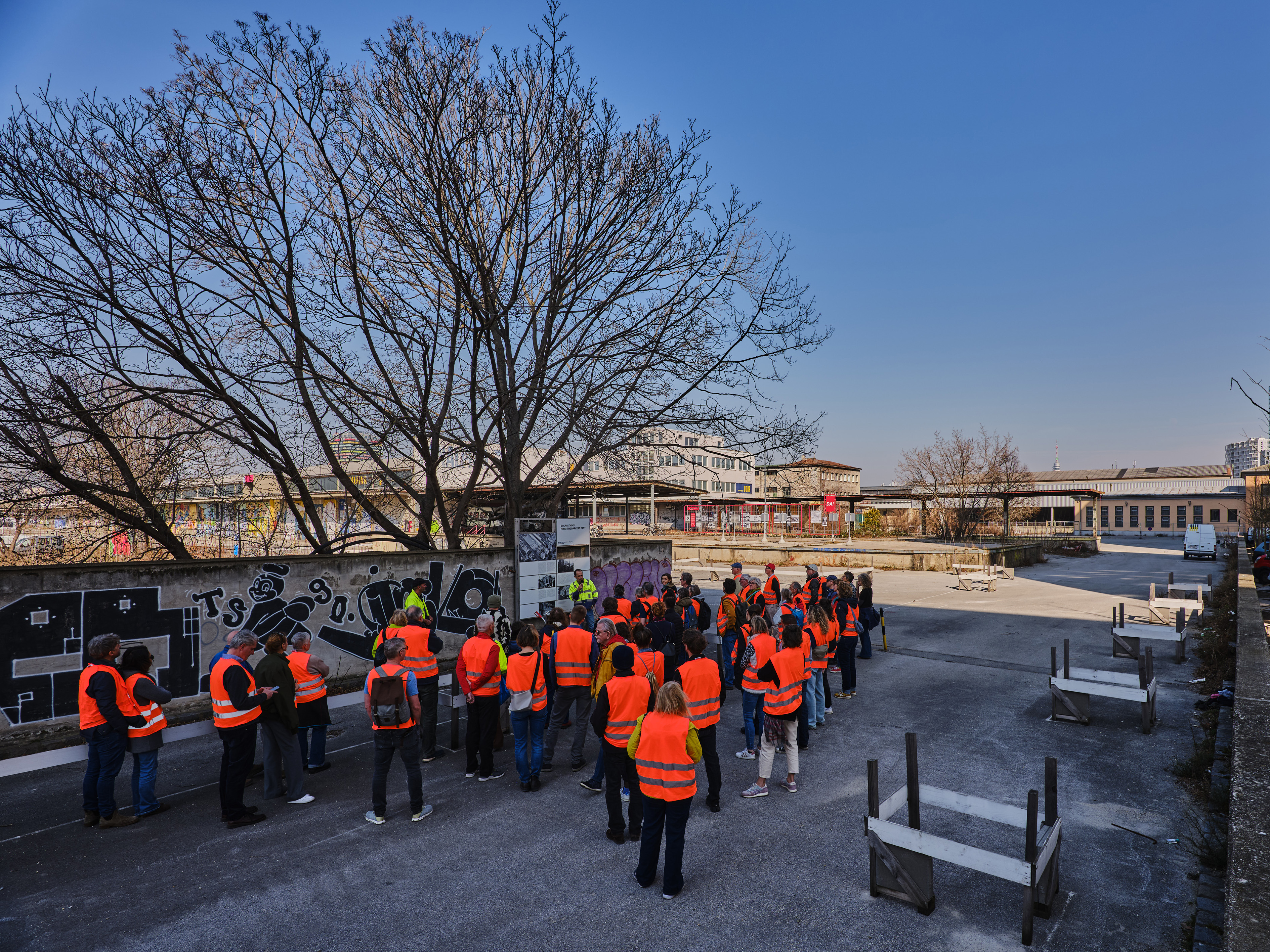 In einer Wanderung über das stillgelegte Bahnhofsareal legen wir anhand der noch verbliebenen Bauwerke sowie der von uns inszenierten Markierungen und Ausgrabungen Schichten aus dessen dunkler, vergessener Geschichte – dem verdrängten Unterbewussten des Areals – frei. Dabei geben wir Einblick in das Making-of unserer Methoden der Erinnerungsarbeit und in die digitale Rekonstruktion der antisemitischen Hassausstellung „Der ewige Jude", die 1938 hier stattgefunden hat.